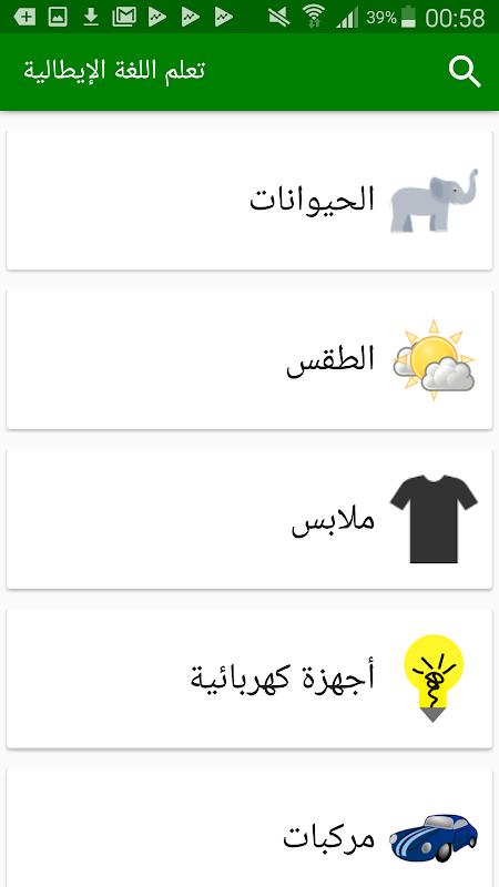 Perkataan yang paling penting dalam bahasa Itali diterjemahkan ke dalam bahasa Arab dengan cara mereka disebutkan.