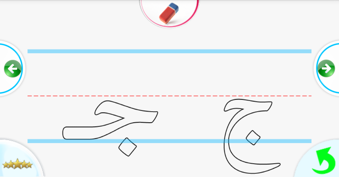 الممحاة: لا تقلق – إذا كان طفلك يلخبط ويريد البدء من جديد في تلوين الحروف العربية، فإن تطبيقنا يحتوي على ممحاة! حيث سيكون بإمكانه محي ما لخبطه ومن ثم البدء من جديد، الأمر الذي يساعده على زيادة ثقته بنفسه.