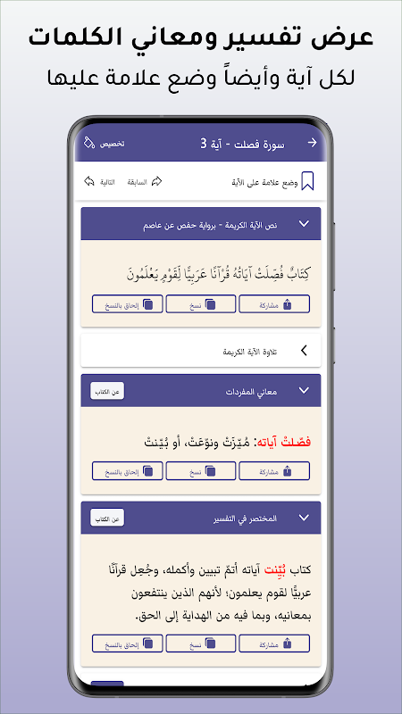 - لمسة واحدة لعرض تفسير الآية ولمسة مطولة لعرض تفسير الكلمة