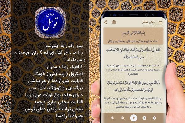 دعای توسل صوتی با صدای آهنگران، فرهمند و میرداماد. با ظاهری مدرن، بدون نیاز به اینترنت با اسکرول (پیمایش) خودکار و همراه با تم شب.vمحمّد بن بابويه اين دعا را از امامان عليهم السّلام روايت كرده و گفته است: در هيچ امرى آن را نخواندم مگر آنكه به زودى اثر اجابت آنرا يافتم.