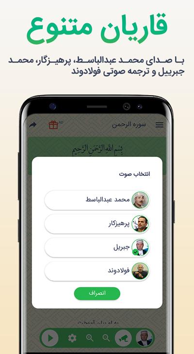 با صدای عبدالباسط، پرهیزگار، محمد جبرییل و همراه با ترجمه صوتی هدایت فر. با ظاهری مدرن، بدون نیاز به اینترنت با اسکرول ( پیمایش ) خودکار و همراه با تم شب. بر اساس برخی روایات اگر کسی سوره الرحمن را قرائت کند، خداوند توفیق شکرگزاری به او میدهد و اگر در آن روز یا شب از دنیا برود شهید محسوب میشود.