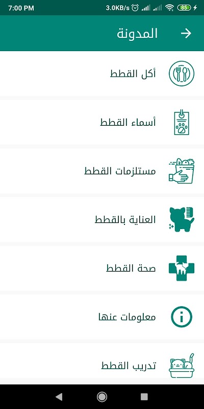 وليس هذا كل شيء فأيضا هناك مواضيع عن ثقافة العناية و الإهتمام بالقطط الأليفة، المواضيع نعمل على تحديثها كل يوم ويمكنكم تصفحها باستعمال صبيب أنترنيت حتى ولو كان ضعيف فالتطبيق خفيف ولا يستهلك أنترنيت كثير.