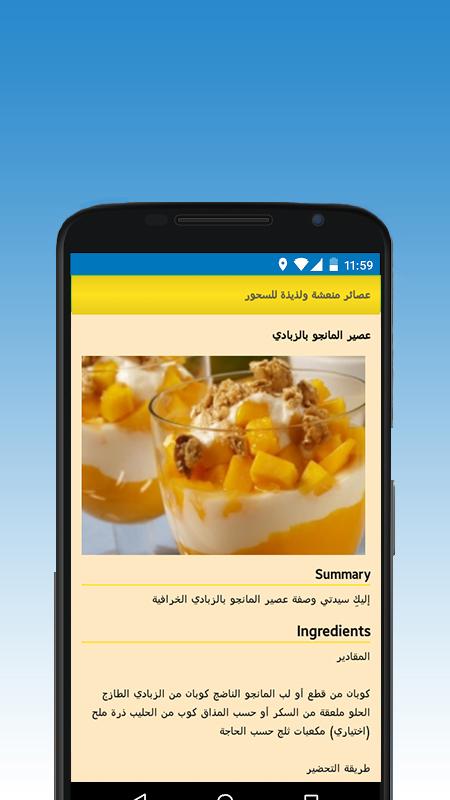 مرحبا بك سيدتي في تطبيق "عصائر منعشة ولذيذة للصيف" الذي يمنحك أفضل وصفات عصائر صيفية و كوكتيل منعش و بارد. في هذا التطبيق ستجدين ألذ وصفات عصير سهلة التحضير في المنزل, اخترناها لكي خصيصا من جميع بقاع العالم العربي. يحتوي هذا التطبيق على اكثر من خمسين وصفة من أحلى العصائر العربية والغربية التي سوف تنال رضا و إعجاب جميع الأذواق هدفنا واحد و هو اسعاد كل بيت و ذلك بتوفير تطبيق يتوفر على العديد من الوصفات اللذيذة التي يمكن أن تقديمها لعائلتك في إفطار والسحور رمضان أو في الصيف الحار