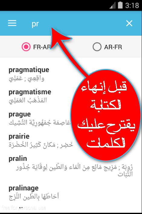 Kamus tafsiran profesional dual untuk membolehkan terjemahan dari Bahasa Arab ke Bahasa Inggeris-Perancis dan naib dari Perancis ke Bahasa Arab secara profesional di mana anda mencadangkan kata-kata sebaik sahaja anda menaip surat atau di mana yang pertama huruf.