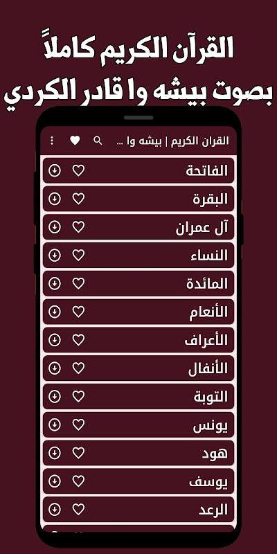 Antara muka yang ringkas dan elegan, di mana anda boleh memilih surah yang anda suka, menambahnya ke senarai kegemaran anda, dan mendengarnya tanpa Internet, dengan suara qari Sheikh Bishah Wa Qadir Al-Kurdi, yang mempunyai suara yang indah yang merendah diri mendengar ayat-ayat Allah.