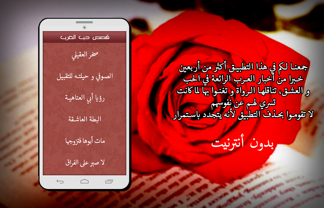 تطبيق قصص حب عربية بدون انترنت يحتوي على قصص و أحداث جد جد رائعة للعديد من القصص و علاقات الحب المشهورة جدا في العالم و التي تركت بصمتها على هذه الكرة الأرضية.