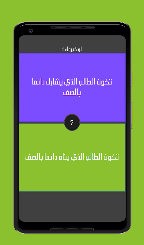 لو خيروك لعبة سهلة تحتوي على مجموعة من الاختيارات المتنوعة و الشيقة و الطريفة و المقززة و المسلية بالاضافة الى انه مجاني و بدون انترنت ،لعبة لو خيروك هي لعبة تحتوي على مجمةعة اختيارات و اسئلة يجب عليك الاختيار بين اختيارين وأن ترى بنفسك هل كان قرارك مثل قرار أغلبية الناس الدين جربو لعبة لو خيروك،يمكنك لعبها ك جهاز كشف الكذب ,يمكنك لعبها مع اخوتك أو ابنائك ب-تحدي لو خيروك ستكون أنت صاحب ضربة معلم هي حقيقة أم جرأة ممتعة لأنها لعبة مسلية ستعجبكم كثيراً ،و-فاجئ اصدقائك وافراد عائلتك وقل لهم من سيربح المليون مع هذا التطبيق الرائع .