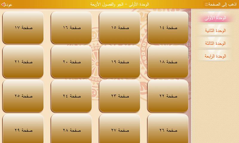 يختار الطالب الوحدة ثم يختار رقم الصفحة فيتم عرض فقرات الصفحة وباختيار الفقرة تظهر الفقرة في صفحة لوحدها بحيث يركز عليها الطالب مع أزار الحل والمسح والتي تتيح للطالب حل التمرين ومسحه لكي يقوم هو بالحل.