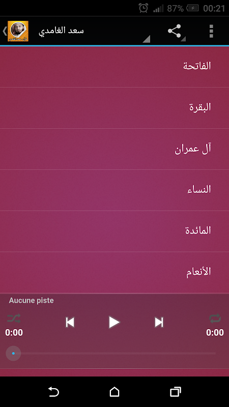 الفاتحة، البقرة، آل عمران، النـســـاء، الـمائدة، الأنــعام، الأعــراف، الأنــفال، التــوبة، يــونس، هـــود، يـوسـف، الــرعد، إبـراهـيم، الـحجـر، الـنحـل، الإســراء، الكــهف، مــريم، طـــه، الأنــبياء، الـــحـج، المـؤمـنون، الـنــور، الــفرقــان، الـشعـراء، الـنـمل، الـقـصـص، الـعنـكبوت، الـــروم، لـقمان، الـسجـدة، الأحــزاب، ســبأ، فــاطر، يــس، الـصافات، ص، الـــزمر، غـــافر، فــصلت، الـــشورى، الـزخـرف، الــدخان، الـجاثية، الأحــقاف، مـحـمد، الــفتح، الـحجرات، ق، الـذاريات، الــطور، الـنـجـم،الــقمـر، الـرحـمن، الـواقـعة، الـحديـد، الـمجادلة، الــحـشر، الـممـتحنة، الــصـف، الـجمـعة، الـمنافـقون، الـتـغابن، الــطلاق، الـتحريـم، الـملك، الـقلم، الـحــاقة، الـمعارج، نـــوح، الـجــن، الــمزمـل، الــمدثر، الــقيامة، الانــسان، المـرسلات، الــنبأ، الـنازعـات، عـــبس، الـتكويـر، الانفطار، المـطففين، الانشــقاق، الــبروج، الــطارق، الأعــلى، الــغاشية، الــفجر، الـبـلد، الــشمس، الـلـيل، الــضحى، الــشرح، الــتين، الــعلق، الــقدر، الــبينـة، الـزلزلـة، الـعاديات، الــقارعــة، الـتكاثر، الــعصر، الــهمزة، الــفيل، قــريش، الــماعون، الــكوثر، الــكافرون، الــنصر، الـمسد، الاخــلاص، الــفلـق، الــناس