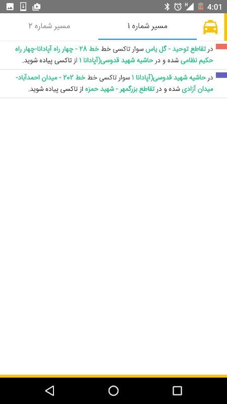 کاربر با ورود به این بخش و کلیک بر روی نقشه مبدا و مقصد خود را تعیین مینماید و سیستم مسیر یا مسیرهای پیشنهادی را از طریق اینترنت از سرور مرکزی دریافت میکند. مسیرها یک به یک بر روی نقشه ترسیم شده و توصیف مرحله به مرحله مسیر نیز در اختیار کاربر قرار میگیرد.