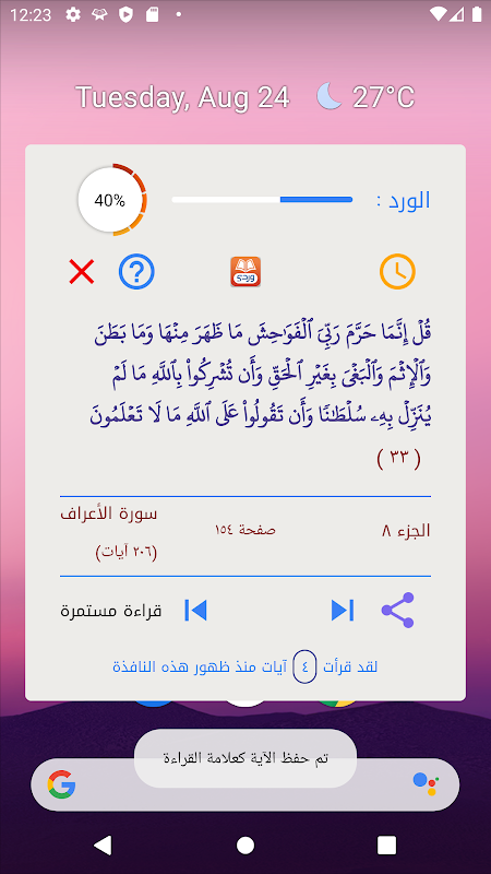 Mereka juga muncul dalam tetingkap yang muncul pada setiap buka kunci skrin dengan ayat terakhir yang telah dihentikan, untuk tujuan mengingatkan dan meningkatkan bacaan, dan anda boleh menangguhkan penampilan tetingkap ini dari tetapan tetingkap dalam aplikasi untuk mengurangkan bilangan penampilan dengan minimum tiga kali sehari dan anda boleh menghentikan penampilan tetingkap ini dari tetapan.