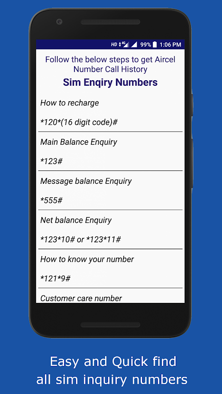 This App provides the details of various operators sim inquiry numbers and kisi bhi number ki call history kaise nikale ?