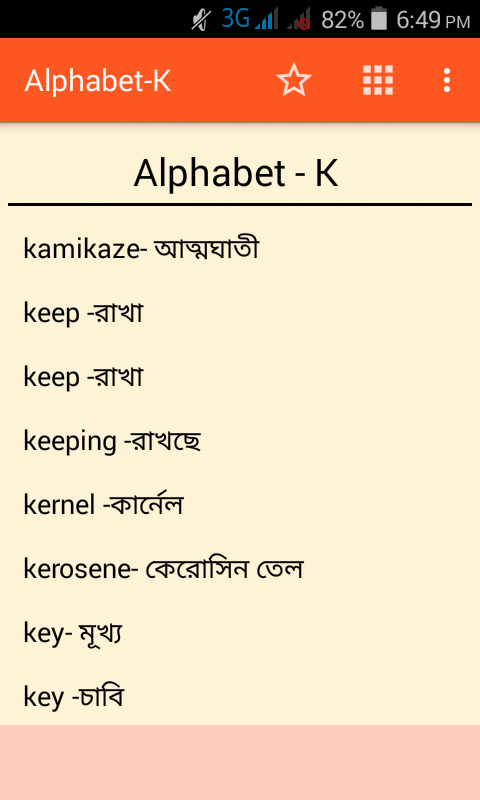 english vocabulary Bangla app is really helpful who wants to improve their knowledge in vocabulary building. This english vocabulary learning app is specially designed for whom those are really interested to english speaking course in bangla. No matter how old you are or how talent you are just download our app and start english learning in bangla. We try to cover the most common vocabulary english to bangla / words to that you can easily translate any words in english to bangla and bangla to english. It's like a wordbook english to bangla. There are many spoken english to bangla app in the marketplace but this is one of the best english speaking course in bangla.