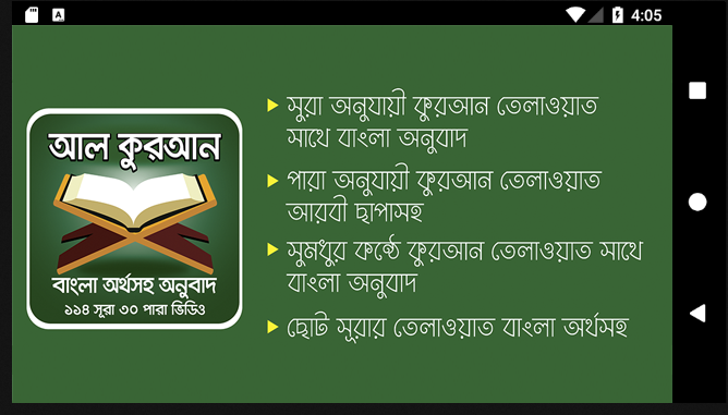 Kitab suci Islam ialah Al-Quran atau Quran Sharif. Al-Quran Syarif diturunkan kepada junjungan kita Nabi Muhammad (SAW). Aplikasi Al-Quran dibuat dengan menambahkan video surah kecil doa yang penting daripada terjemahan Quran Bangla dan makna Quran Bangla dan Quran Sharif. Semoga anda dapat membaca dan menghafal Surah-surah Al-Quran Syarif dengan betul dengan melihat aplikasi Al-Quran terjemahan Benggali Arab.