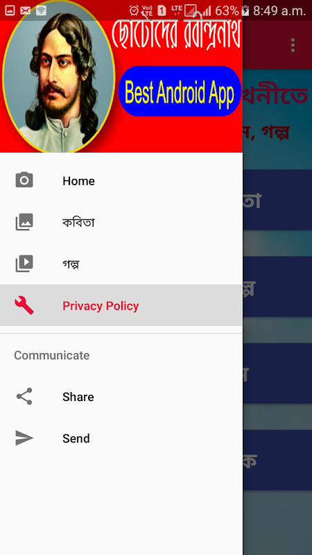 Sekarang semua Puisi, Cerita, Novel, Lagu, Lagu, Esai dan tulisan lain boleh didapati sebagai App Android. Anda boleh mencari dan membaca kesusasteraan Rabindranath Tagore dengan mudah menggunakan aplikasi ini dan ia tidak memerlukan sambungan internet. Anda juga boleh menandakan item kegemaran anda dan menganjurkannya.