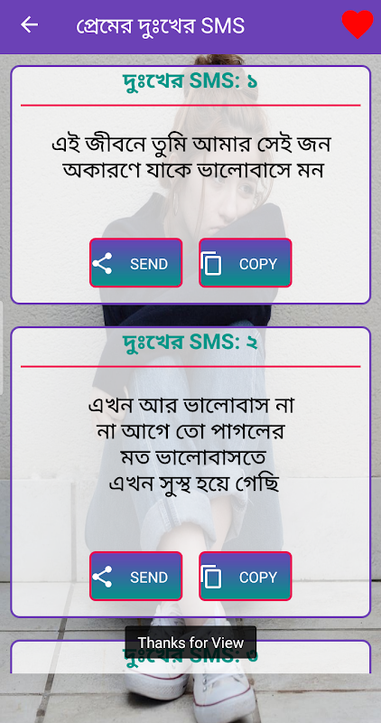 সেই কষ্টকে সহ্য করতে না পেরে অনেকেই এই পৃথিবীর বুক থেকে চিরতরে চলে যায়।এই অ্যাপটিতে রয়েছে সকল ছ্যাকা খাওয়া দুঃখের এসএমএস ।