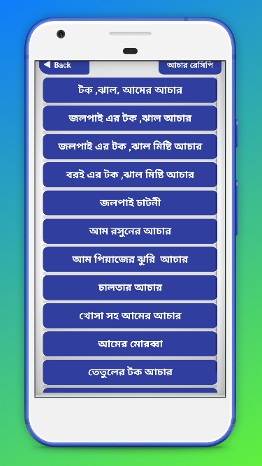 এই অ্যাপটিতে আরও আছে- আমের খোসা সহ টক আচার চালতার টকঝাল আচার পিঁয়াজের আচার টমেটোর আচার বোম্বে মরিচের আচার কদবেলের আচার আলু বোখাবার আচার আস্ত জলপাইয়ের আচার।শুকনা বড়ইয়ের ঝাল আচার আম রসুনের ঝাল আচার টক তেঁতুলের আচার