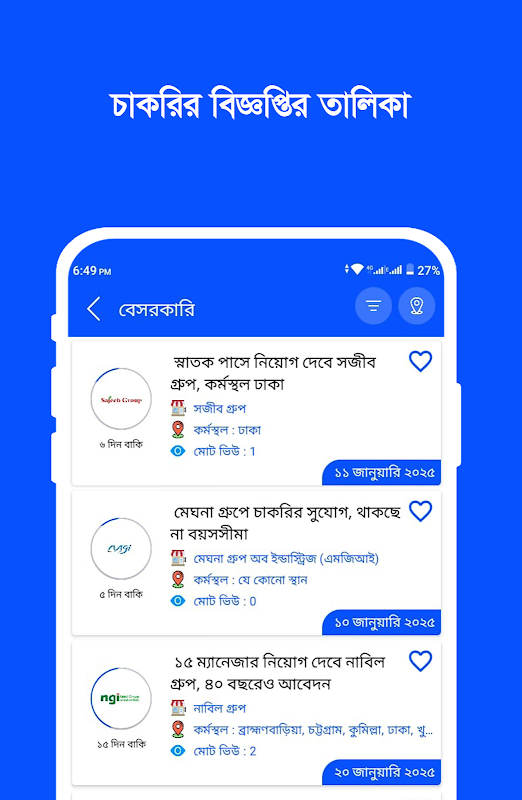 এই অ্যাপটিতে বাংলাদেশের সকল চাকরির খবর প্রকাশ করা ়। এটি নিয়োগ সংক্রান্ত গুরুত্বপূর্ণ তথ্য সরবরাই, করুই, করুই চাকরির বিজ্ঞপ্তি, যাতে ব্যবহারকারীরা চাকরির সুযোগিের জ্ঠিের জনির তথ্য সঠিক সময়ে পেতে পারেন। তাই, এই দৈনকারীদের অ্যাপটি সকল চাকরি সন্ধানকারীদেনয জঅ্য্য প্রয়োজনীয়। এখানে সকল চাকরির খালি স্থান এবং পত্রিকা ও অনলাইন ইেবেন চাকরির সার্কুলার একত্রে উপস্থাপন করা হয়। এর ফলে ব্যবহারকারীরা তাদের চাহিদামতো চাকরির সার্কুজসো খুঁজে পেতে পারেন।
