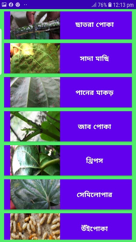 . Aplikasi ini mempunyai bahagian kawalan penyakit dan serangga - busuk batang, reput akar, reput akar, busuk daun, reput daun bakteria, anthracnose, cendawan serbuk, terkulai, serangga pelajar, lalat putih, labah-labah sirih, serangga tusukan, thrips, semilopar dan Pencegahan dan pengurusan kawalan.