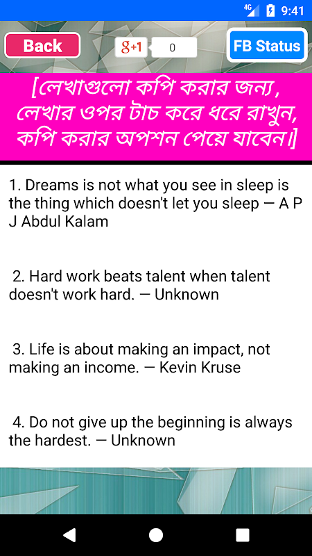 এতে আছে খুব সহজে কপি করার অপশন। আপনি এখান থেকে স্ট্যাটাস কপি করে যেকোনো যায়গায় পেস্ট করে দিয়ে সেন্ড বা স্ট্যাটাস আপডেট করতে পারবেন। এপটিতে কষ্টের স্ট্যাটাস, রোম্যান্টিক স্ট্যাটাস, ফানি স্ট্যাটাস, প্রেমের স্ট্যাটাস, সেরা উক্তি , বিখ্যাত উক্তি সহ আরো অনেক কিছু পাবেন।