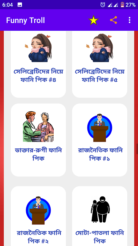 ফানি পিক ফেসবুক ট্রল নিয়ে আমাদের এই অ্যাপটি আশা করছি আপনাদেরকে কিছুটা হলেও আনন্দ দিতে পারবে. ফানি ট্রল পিকচার বা বেস্ট ফ্রেন্ড স্ট্যাটাস ছবি সহ অ্যাপটি কে 5 স্টার দিয়ে এগিয়ে যেতে সহায়তা করুন.