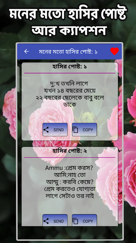 এই অ্যাপসটিতে যে সব হাসির পোষ্ট আর ক্যাপশন আছে তা অপনি বন্দুদের সাথে ১ কিল্কে কপি এবং শেয়ার করতে পারবেন ।প্রতিটি পোস্ট আর ক্যাপশন বাছাইকৃত ভাবে নেওয়া হয়েছে । আশা করি অ্যাপসটি আপনাদের অনেক ভালো লাগবে।