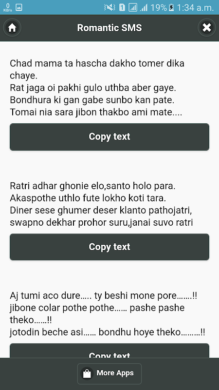 Bangla SMS বা ভালোবাসার মেসেজ অ্যাপটি অনেকটা এসএমএস বাংলা বই এর বিশাল সমাহার। আজকাল অনেকেই bangla sms পড়তে পছন্দ করেন, আবার কেউ কেউ বিভিন্ন দিবসে যেমন (বন্ধু দিবস, friends day , valentine day, ভালবাসা দিবস ইত্যাদি ) এস এম এস বাংলা বা ভালবাসার বাংলা এস এম এস প্রিয়জনকে দিয়ে থাকেন।