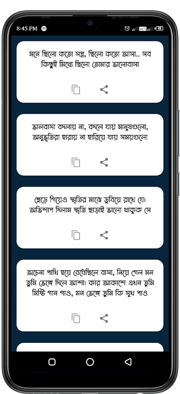 Petikan Bahasa Bengali Manbhangashayari- Dibuat secara percuma untuk semua orang yang berbahasa Bengali dari mana apa-apa jenis sms sedih shayari facebook whatsapp tetas boleh didapati dengan mudah di sini. Satu yang sangat mudah boleh digunakan oleh sesiapa sahaja Daripada jumlah ini, lebih 500+ SMS mempunyai koleksi Tetas