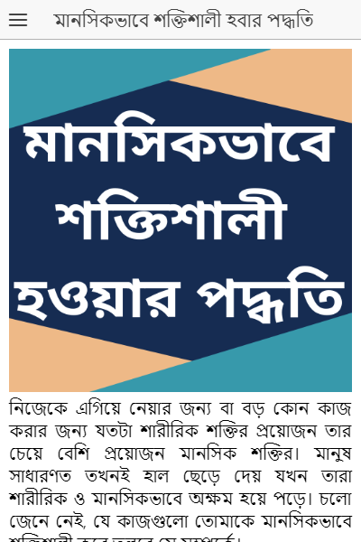 ফলতার জন্যে যে মানসিক শক্তির প্রয়োজন তা অর্জন করতে হয়। চিন্তাধারা ইতিবাচকভাবে গড়ে তুলতে হয়। এর সঙ্গে ক্ষতিকর অভ্যাসগুলো থেকে দূরে থাকাও জরুরি। তারাই সবচেয়ে শক্তিশালী যাদেরকে আমরা যুদ্ধ করতে দেখি না। কিন্তু শেষ অবধি তারাই বিজয়ী হন। তাহলে জেনে নিন মানসিকভাবে শক্তিশালী হওয়ার কার্যকর পদ্ধতিগুলোর কিছু। এই এপ আপনাদের ভাল লাগলে আরোও যুক্ত করা হবে। আপাতত যা পাবেন তার তালিকা নিচে ইয়েয়ার হল।
