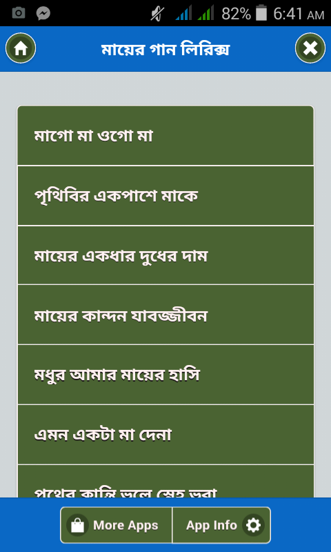 মায়ের গান শুনলে আমাদের সকলেরই শরীরের লোম দারিয়ে যায় কারন প্রত্যেকটি মা নিয়ে গানই মায়ের ত্যাগ এবং আমাদের জন্য কষ্টের কথা বলে তাই মা নিয়ে এই সকল গানগুলো মায়ের প্রতি আমাদের দায়িত্ব আরও বেশি করে বারিয়ে দেয়। আপনি শুনে খুশি হবেন যে আমাদের এই অ্যাপ এর সকল বাংলা গান বিশেষভাবে যাচাই বাছাই করে নির্বাচিত।