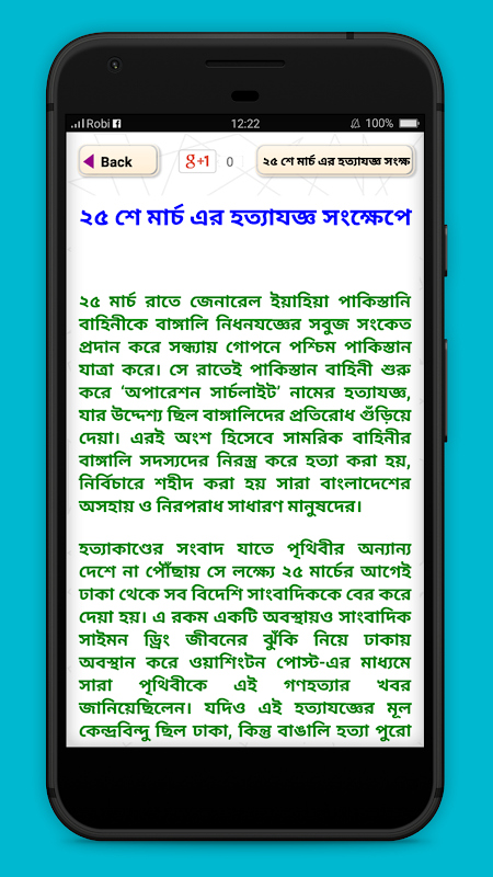 বাংলাদেশের ইতিহাসের সবচেয়ে কালক্ষয়ী হচ্ছে মুক্তিযুদ্ধ’ ১৯৭১। আমাদের দেশের ইতিহাসে যা ভোলার নয়। তিরিশ লক্ষ শহীদের প্রান ত্যাগের বিনিময়ে পেয়েছি আমরা আমাদের এই বিজয়। প্রতিটা বছর আমরা নানা ভাবে উদযাপন করি বিভিন্ন দিবস গুলো যেমন বিজয় দিবস, স্বাধীনতা দিবস, এমনকি ১৯৫২ এর ভাষা আন্দোলন পেয়েছে বিশ্বব্যাপী আন্তর্জাতিক মাতৃভাষা দিবস এর স্বীকৃতি। ১৯৪৭ এর দেশ বিভাগের পর জন্ম নেয় দুই দেশ পশ্চিম ও পূর্ব পাকিস্তান, পশ্চিম পাকিরা আমাদের উপর চালায় নানা নির্যাতন এমন কি কেড়ে নিতে চায় মুখের ভাষাটুকু। তাই শুরু হয় দেশ রক্ষার লড়াই।তারই পরিপ্রেক্ষিতে প্রথমে ভাষা আন্দোলন ও পরে সমগ্র জাতি নেমে পড়ে যুদ্ধে, দেশ জয়ের যুদ্ধে। আমরা লাভ করি আমাদের বিজয়। আমাদের এই অ্যাপটিতে পাবেন মুক্তিযুদ্ধের ইতিহাস,মুক্তিযুদ্ধের সংক্ষিপ্ত ইতিহাস ,বাংলাদেশের ইতিহাস History BD ,যুদ্ধদলিল ,বাংলাদেশের ৬৪ জেলার ইতিহাস,মুক্তিযুদ্ধের গান ইত্যাদি