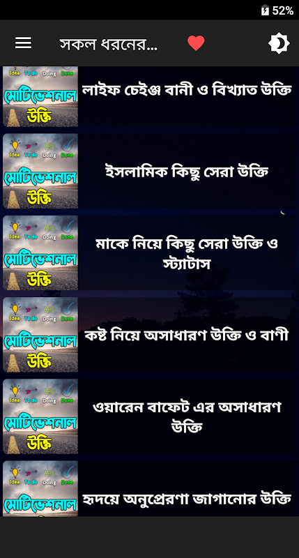 আসসালামু আলাইকুম। বাংলা পাওয়ার ফুল মোটিভেশনাল উক্তি নিয়ে আমাদের অ্যাপটির আয়োজন। জীবনের চলার পথকে সহজ করে তুলে। সাফল্যের শিখরে পৌছানো বিখ্যাত মানুষদের যে উক্তি গুলো বদলে দিবে আপনার জীবন. ১ টি সুন্দর কথা মহামূল্যবান হীরার থেকেও দামী। হতাশা, গ্লানি, ব্যর্থতা যখন চারপাশ হতে ঘিরে ধরে- তখন আমাদের মনে আশার মশাল জ্বালাতে পারে মূল্যবান কিছু আশা জাগানিয়া কথা, জীবনকে নানান এঙ্গেল থেকে পর্যবেক্ষণ করা বিখ্যাতদের সহজ সরল উক্তিগুলো। বন্ধুরা সকল ধরনের বিষয় থেকে ও বিখ্যাত কিছু ব্যাক্তিদের কাছ থেকে বাছাই করে আপনাদের জন্য সকল ধরনের মটিভেশনাল উক্তি এড করা হয়েয়ে এই অ্যাপটিতে, আশা করি আপনাদের কাছে খুব ভালো লাগবে এই অ্যাপটি।