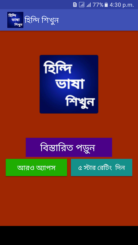 হিন্দি ভারতবর্ষের পূর্ব-মধ্যপূর্বাঞ্চলের একটি উল্লেখযোগ্য ভাষা। বর্তমানে হিন্দি ভারতের রাষ্ট্র ভাষা। দিল্লি, উত্তরপ্রদেশ, উত্তরাখণ্ড, ছত্রিশগড়, হিমাচল প্রদেশ, চণ্ডিগড়, বিহার, ঝাড়খণ্ড, মধ্যপ্রদেশ, হরিয়ানা এবং রাজস্থানের অধিকাংশ মানুষ এই ভাষায় কথা বলে। এছাড়া ভারতের অন্যান্য প্রদেশে রাষ্ট্রভাষার সুবাধে এই ভাষার ব্যবহার রয়েছে।আমরা অনেকেই বিভিন্ন সময় বিভিন্ন দেশে ভ্রমনে যাই তার কারণে আমাদের নানা রকম ভাষা শিখার প্রয়োজন পরে। আর যদি এসব দেশের ভাষা না পারা যায় বিভিন্ন রকম ভাষার জটিলতায় পরতে হয়।আর তাই যসব দেশের ভাষা সবচেয়ে প্রচলন বেশি তার মধ্যে হিন্দি ভাষা অন্যতম।আমরা যারা বাংলা থেকে হিন্দি শিখতে চাই তাদের জন্য আমার এ অ্যাপ।যা থেকে খুব কম সময়ে হিন্দি শিখতে পারবেন।
