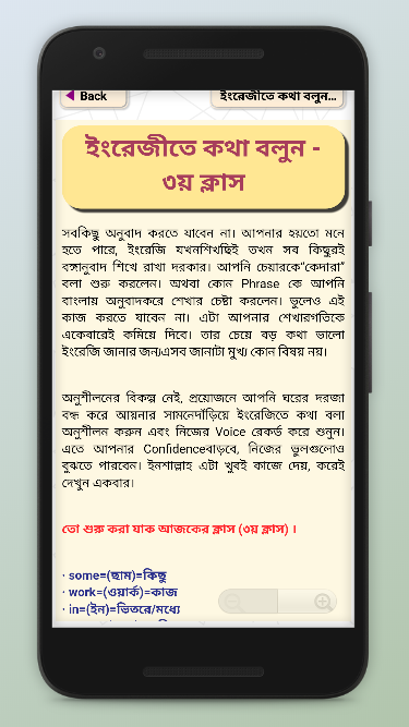 অল্প দিনে সহজে ইংরেজী শেখার বা সহজে ইংরেজিতে কথা বলা আয়ত্ত করতে কে না চায়! মাত্র ৩০ দিনে ইংরেজিতে কথোপকথন আয়ত্ত করার জন্যে আমরা নিয়ে এসেছি সহজে ইংরেজি শিক্ষা অ্যাপটি। সহজে ইংরেজী কথা বলার জন্যে ইংরেজি গ্রামার শেখার প্রয়োজন শুরুতেই তেমন একটা নেই। আমাদের অ্যাপে থাকা ক্লাস গুলো ধারাবাহিকভাবে অনুশীলন করে শিখতে পারবেন ইংরেজি শেখার কৌশল এবং জানতে পারবেন ইংরেজিতে কথা বলার সহজ উপায়। ইংরেজী শেখার সহজ বই বাজারে পাওয়া গেলেও সর্বাবস্থায় বই নিয়ে ঘুরাঘুরি করা সম্ভন নয় বিধায় আমাদের এই আয়োজন ইংরেজিতে কথা বলার সহজ অ্যাপ।