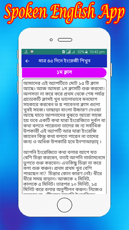 ইংরেজী জানা আমাদের সকলের জন্যই অত্যন্ত প্রয়োজনীয়। জীবনের প্রতিটি ক্ষেত্রেই আমাদের ইংরেজীর সম্মুখীন হতে হয়। এখনকার সময়ে ভালো একটা চাকরি পেতেও ইংরেজীতে দক্ষ হতে হয়। তাই আপনাদের ইংরেজীর ভয় দূর করার জন্য আমরা মাত্র ৪৫ দিনে ইংরেজী শিক্ষার ফুল কোর্স নিয়ে এসেছি। আশা করি আমাদের অ্যাপটির মাধ্যমে মাত্র ৪৫ দিনেই ইংরেজীতে দক্ষ হয়ে উঠতে পারবেন। অনেকে মনে করে যে ইংরেজীতে কথা বলা কোন সহজ কাজ নয় এর জন্য অনেক বড় বড় কোর্স করে গ্রামার শিখতে হবে অনেক শব্দার্থ শিখতে হবে। আমি তাদের বলতে চাই ইংরেজিতে কথা বলার জন্য কোন গ্রামারের প্রয়োজন হয় না। মাত্র ৪৫ দিনেই ইংরেজিতে কথা বলতে চান তাহলে প্রত্যেকটি ক্লাসে ২দিন করে সময় দিবেন । ক্লাস গুলো খুবই সহজ পদ্ধতিতে সাজানো হয়েছে যাতে আপনারা সহজেই বুঝতে পারেন।