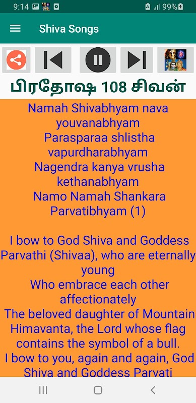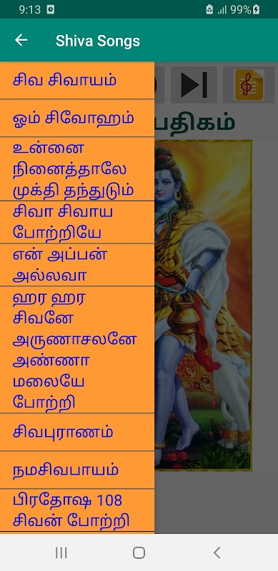 Lagu Sivan dalam talian dalam bahasa tamil mp3 memainkan lagu Sivan Tamil tentang tuhan Sivan dalam bahasa tamil. Aplikasi ini mengandungi Lagu audio Sivan audio tanpa henti. Tidak perlu muat turun audio Tamil Lagu Sivan hanya strim lagu Sivan tamil dari dalam talian. Pemain dalam talian lagu Siva tamil memerlukan Internet untuk memainkan lagu audio. Audio Lagu Sivan ialah bunyi yang jelas dan kualiti yang baik.
