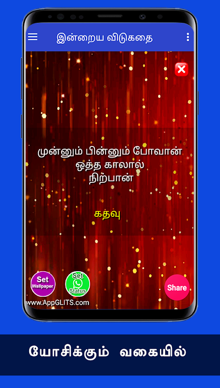 முழுக்க முழுக்க விடுகதைகளை மையப்படுத்தியே இந்த ஆன்ட்ராய்டு செயலியை உருவாக்கி உள்ளோம். இந்த செயலி வழியாக நீங்கள் பல்வேறு விடுகதைகளை படித்து மகிழலாம். நண்பர்களே !! இந்த செயலியின் மூலம் உங்களுக்கு விருப்பமான நேரத்தில், விடுகதைகளை மொபைல் போனில் நோட்டிபிகேஷனாக பெறலாம். இன்னும் ஒரு நல்ல விஷயம் என்னவென்றால், வாட்சப், பேஸ்புக், டிவிட்டர், ஈமெயில் வழியாவும் உங்கள் நண்பர்களுக்கு ஷேர் பண்ணலாம்.