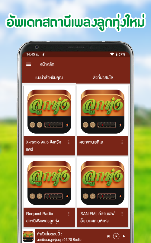 🎶 Aplikasi "Dengar lagu luk thung dalam talian 24 jam sehari" termasuk lagu luk thung yang paling popular. muzik desa terkini Bagi mereka yang suka mendengar muzik negara dalam talian. Terdapat kedua-dua lagu baharu dan lama. Kemas kini muzik percuma. untuk mendengar muzik dalam talian 24 jam sehari melalui aplikasi mudah alih atau sistem tablet Android secara percuma Koleksi lagu desa popular minggu ini Mari kemas kini untuk mendengar lagu yang mencecah carta dari stesen radio dalam talian. Lagu-lagu Lukthung, yang merangkumi pelbagai artis dan genre. kedua lagu Thai luk thung Lukthung seumur hidup Lagu Lukthung seumur hidup, Lukthung Mo Lam, lagu lukthung lama dengar dan bergembiralah Daripada bunyi muzik yang datang dari padang dan luar bandar, menyampaikan loghat Thai melalui muzik. Itu telah diterima oleh peminat di seluruh langit di Thailand. untuk semua orang mendengar lagu negara yang paling popular melalui peranti android secara percuma