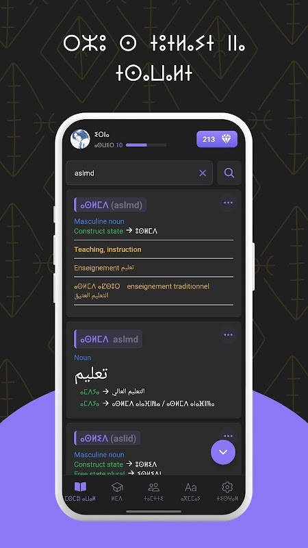 • Kamus Komprehensif: Akses koleksi perkataan Tamazight yang luas dengan terjemahan dalam pelbagai bahasa, termasuk bahasa Inggeris, Perancis dan Arab.
