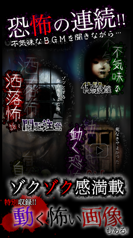 ◎怪談話や恐ろしい話は全て実録(ほん怖)!更に、超絶怖いGIF動画も収録!怖いBGM付きで雰囲気を演出!