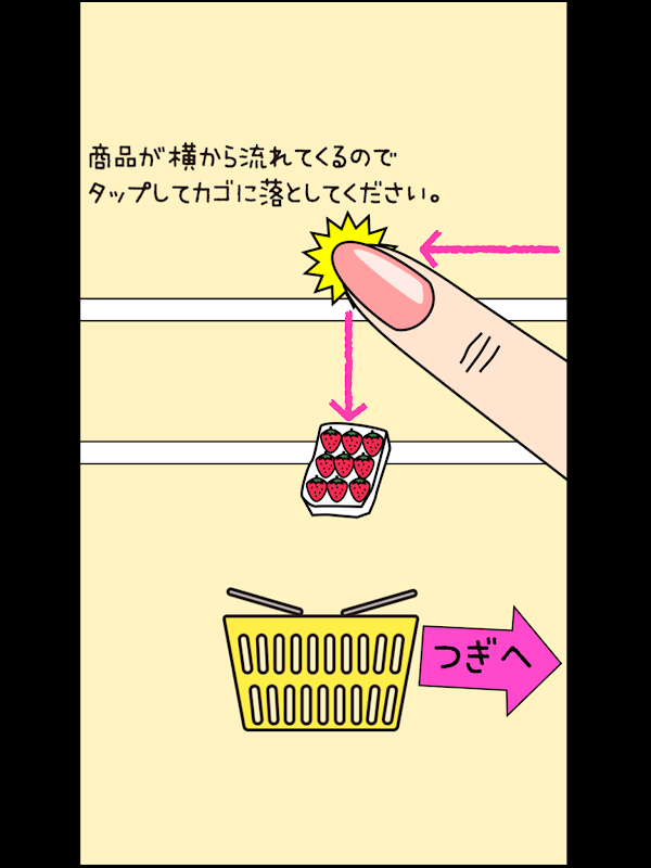 やり方は超簡単! 商品が横から流れてくるので、タッチしてカゴに