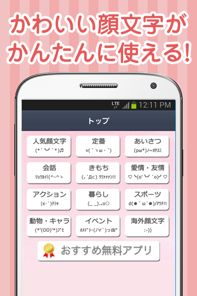 顔文字(かおもじ)アプリの決定版がついに復活!!!!厳選されたかわいい顔文字だけ約1万点集めた顔文字パレットです。特殊文字やライン記号も充実!