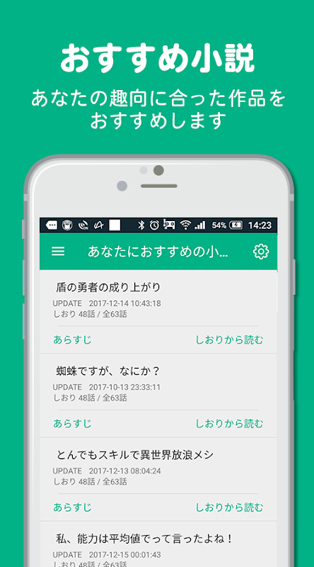 「小説家になろう」グループに投稿された小説をスマホで見やすく、快適に表示できるアプリです。小説家になろう、小説を読もう専用リーダーアプリとなっております。