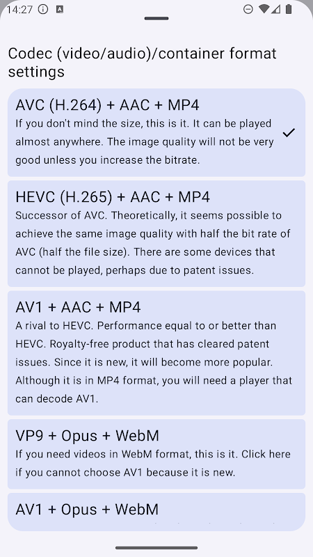 Anda boleh mengekod semula video yang dipilih ke AVC/HEVC/VP9/AV1 pada peranti.