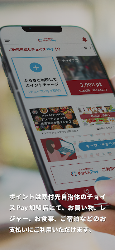 Choice Pay ialah apl yang membolehkan anda menikmati perjalanan dan membeli-belah dengan mata yang anda terima sebagai hadiah terima kasih untuk pembayaran cukai kampung halaman, dikendalikan oleh "Furusato Choice", tapak pembayaran cukai kampung halaman dengan bilangan hadiah terima kasih tertinggi /kerajaan tempatan di Jepun.
