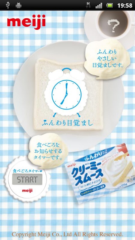 その他、本アプリには「明治クリーミースム~ス」をふわふわで食べられる、食べごろ時間をお知らせする「食べごろタイマー」もご用意しております。