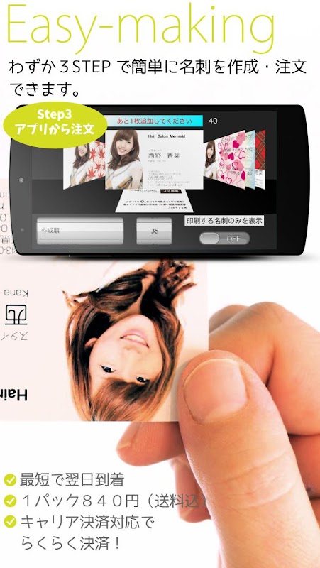 シンプルなビジネス名刺はもちろん、パーソナルカード、オリジナルトレカ、ペット名刺、ママ友名刺、コスプレ名刺など、シチュエーションに応じたお好みの名刺(カード)を作成&即ご注文できるアプリです。