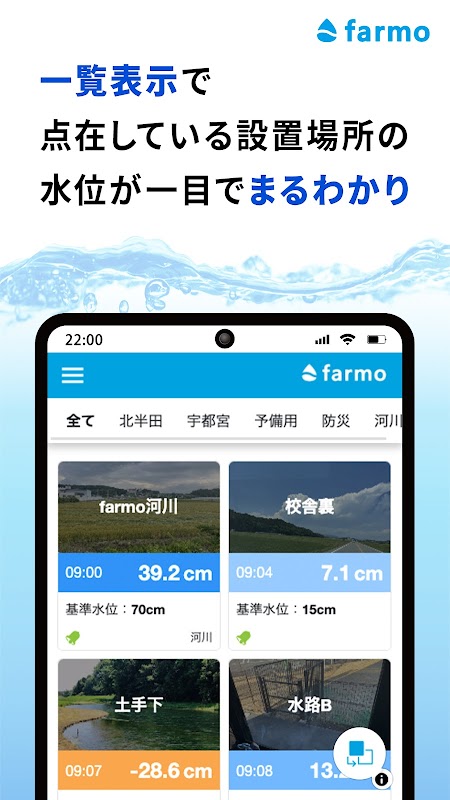 Anda boleh melihat lokasi penderia dan paras air sekilas pandang pada paparan peta, dan anda boleh memahami perubahan paras air secara intuitif dengan menyemak graf.