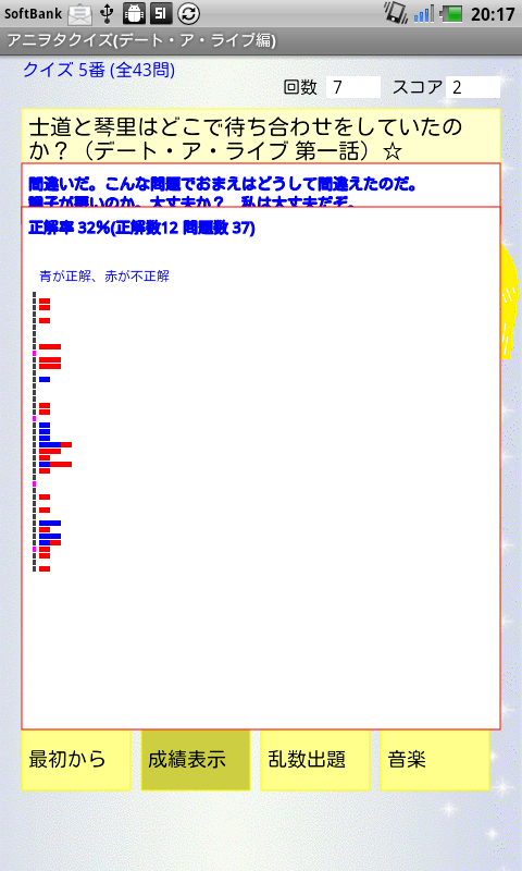 クイズの成績をファイルに保存でき、各設問の正解状況を表示することもできます!