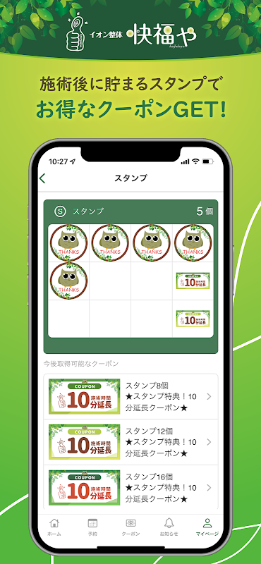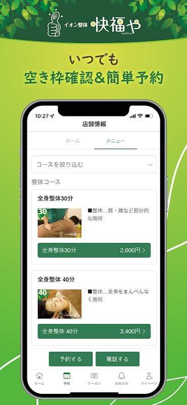 アプリを通して鳥取中央整体院の新着情報やお得な情報を受け取ることができます。また、いつでもお手元のスマートフォンから、メニューやご希望のお時間帯のチェック・ご予約などが可能です。アプリをインストールしていただくことによりイオン整体 快福やを、より便利に身近にご利用していただけます。